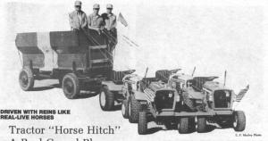 In and around Shelbyville, Ill., Barker Brothers Equipment Company, has come up with this multiple hitch of four garden tractors pulling an old flare bed wagon, and controlled strictly with reins.