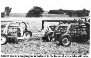 "It's about as simple as can be. I made it from the center pole of a heavy-duty wagon gear. The pole telescopes in and out at 1-ft. intervals. All the holes were already bored in the pole and were just perfect for fastening to the frame of my New Idea 400 rake. I made a drop hitch out of angle iron at the end of the pole to hook up to the trailing Deere rake.