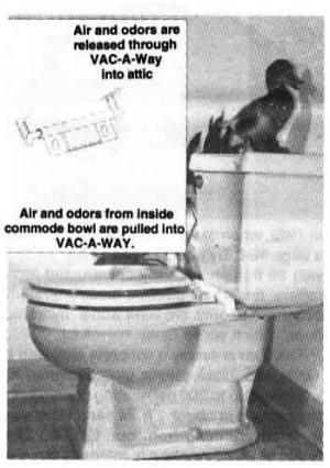 The simple device simply bolts in place between the toilet lid and the bowl using the same bolts that hold the lid. A small dia. hose attaches to both sides of the unit and an opening extends out under the toilet lid into the top of the bowl. A suction fan mounts up in the attic or crawl space and is wired to a wall switch in the bath-room.