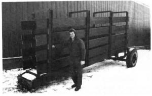 Bauer bought a junked-out semi-truck with no engine from a trucking company for $50. He stripped the truck down to the frame and front axle, leaving the 20-in. tires and leaf springs on the axle. He welded the steering tie rods solid to the axle to keep the wheels from moving and welded a series of 1-ft. wide channel irons between the frame rails to support the floor. Vertical side rail supports made from 5-in. channel iron hold eight 2 by 12 wooden boards bolted onto the channel irons to form the chute.