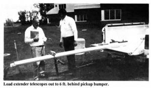 "It works great for hauling irrigation pipe, lumber, ladders, carpets, canoes, etc. Any type of long load," says Larry Mages, whose brother-in-law Joe Gall came up with the invention. "The arm has holes in it for tieing the load down."