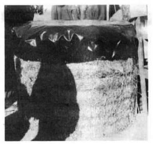 The caps keep water out of the center of the bale and can be used on just the top bale of a 2 or 3-bale stack, if desired. Wheeler says there's less waste - since the caps are reusable - and less expense with no need for a special bale-wrapping machine.