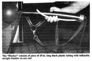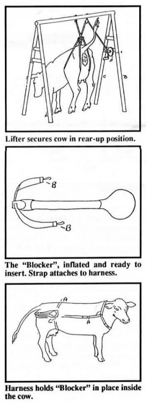 Their new "Blocker" painlessly holds the uterus in place inside the cow and is easy to insert and remove. It consists of a piece of black plastic tubing about 20 in. long. On one end is an air valve and a mechanism for fastening the tubing to a nylon harness that holds the Blocker in place inside the cow. On the other end is an inflatable, airtight bladder. The unit is left in place inside the cow for three days, then removed by releasing the air from the bulb after the cow's cervix has shrunk back to normal size. The plastic tubing is discarded for sanitary purposes, but the rest of the unit can be cleaned and reused.
