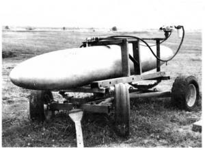 B.L. Uhnken, Jacksonville, Ill., converted the discarded surplus tank for farm use by building a trailer-mounted carrying frame that allows the tank to hang just like it would on an airplane wing. That's the only way he could make use of the lightweight (75-lb.) tank. If you mounted it any other way, it would not hold up.