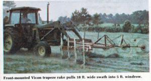 "This front-mounted rake lets you rake and bale up to 80 acres a day - on hilly or level ground," says Caraway, inventor of the just-introduced rake frame. It mounts on most any front-end tractor loader and is fitted with Vicon Farm Machinery trapeze rakes. With your rake up front, you can pull the baler behind the tractor - eliminating one trip through the field.