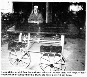 "My wife and I wanted a different kind of picnic table," explains Miller. "This one is real sturdy and heavy. All haying equipment in those days was horse-drawn, including the baler. The horse walked around in circles to drive the plunger while men used pitch forks to feed hay into the comaction chamber."