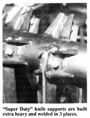 Super Duty Conversion: Warranteed for three years, it involves installing a complete new set of knives and mounting brackets. On Deere choppers, for example, it covers: remove chopper from housing, cut off all blade supports (gussets), grind rotor smooth, install new super duty supports with three welds, straighten rotor, install new bearings, bearing flanges, new chopper blades, heavy duty oversize bushings, and balancing chopper with all blades attached and in their own bearings.