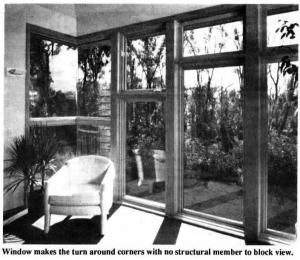The window was made possible by a new 2-stage heating process to bend the glass with no visual defects. The window's avail-able in 7 sizes up to 60 in. tall and 40 in. wide from corner to edge, which gives 80 in. of glass around a corner. Windows can be stacked to provide a 10-ft. tall see-through corner. The frame is 1-5/16-in. thick pine with strong 4 9/16-in. jambs. The 1-in. space between the double panes of glass is filled with insulating argon gas.