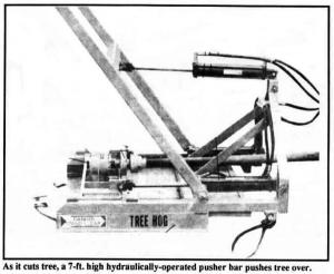 The pto-powered "Tree Hog" mounts on a tractor. Its 40-in. dia., 3/4-in. steel-plate cutting wheel is mounted inside a steel housing. As it cuts, a 7-ft. high hydraulically-operated pusher bar pushes the tree over. A pair of built-in logger tongs allow the operator to hook, haul, and unhook the felled tree without leaving the tractor seat.