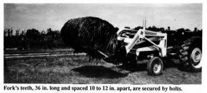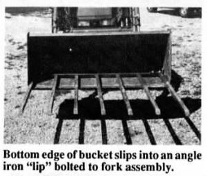 Standard heavy duty fork assemblies are available to fit most buckets from 3 to 8 ft. wide. A 6 ft. wide fork sells for $329. Initial installation requires drilling two holes in the bucket, one on each side, for the removable pins.