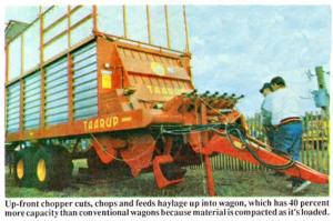 Mogens Nielsen, export manager, field tested and demonstrated three of the ma-chines throughout Wisconsin last summer. "It lets one man chop haylage twice as fast as with a conventional forage harvester and wagon. The wagon has up to 40% more capacity than a comparable size conventional wagon due to greater compaction of haylage. Haylage is compressed from above as it's forced up into the wagon instead of being blown in by a forage harvester. The extra capacity means you make far fewer trips from field to silo. Once the wagon is loaded there's no need to hook it up to another tractor. It rear unloads in two minutes compared to 8 to 15 minutes with a conveyor-unloading wagon.