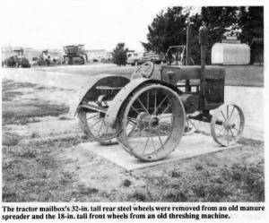 Cheney and his brother Mike built the 36-in. high "tractor mailbox" two years ago as a Christmas gift for their parents. "I always liked the style of old D tractors. The first ones had a spoked flywheel, but no exhaust pipe. My replica is based on models that were built two or three years after the first ones came out. I used a photograph and a model that I saw to build it. My neighbor Joe Zachgo helped me. I plan to apply Deere decals to the sides of the tractor."