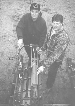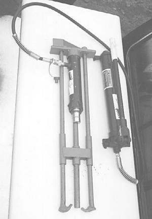 The Stalk Roller Puller consists of a 10-ton porta-power jack in a special holder. It operates a 12-in. by 2-in. hydraulic cylinder with a 1 1/2-in. dia. ram that pushes on a rod between two extractor hooks. The rod pushes on the end of the stalk roller while the hooks pull it off.