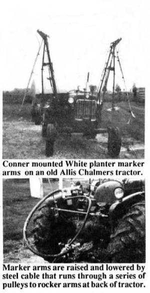 The marker arms are raised and lowered by steel cable that runs through a series of pulleys to the rocker arms at the back of the tractor. Raising the rocker arms folds up the marker arm booms.