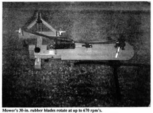 The 3-pt. hitch mower's rubber blades, made from combine bats, are 30 in. long, 2 in. wide and 3/4-in. thick. An hydraulic orbit motor turns the adjustable-speed blades at up to 670 rpm's. The mower has a 6 ft. reach and is adjustable to cut 45? above or below horizontal.