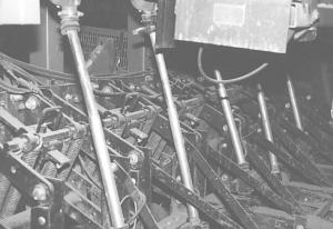 To plant soybeans, Conrad made new seed tubes for his drill out of electrical conduit. Each two-piece tube is made of 1-in. dia. and 3/4-in. dia. conduit. The smaller conduit telescopes inside the larger piece so the tubes flex with the drill.