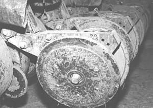 To plant corn in 30-in. rows, Conrad replaced one of the rubber tires on each pair of closing disks with an iron ring. The 3/4-in. wide rings are 1 1/2-in. larger in dia. than the original rubber tire so they run 3/4-in. deeper.