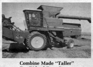 1. He made the combine 2 in. taller up front by equipping it with single 18.4 by 42 in. Kirchner wheels, and 3 in. taller at the rear by extending the plates on the axle A-frame.
