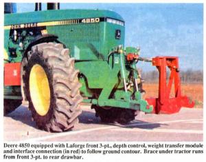 The 4-ft. wide model is powered by an 8 hp Briggs & Stratton engine and the 5-ft. model has an 11 hp Briggs & Stratton engive.The engines are available with a choice of electric or recoil start. The mower's front two gauge wheels provide free-turning action. The two rear wheels are stationary. Wheels adjust to eight different positions to provide cutting heights from 1 to 5 in. The mower deck weighs 390 lbs. The offset hitches swing up out of the way for transport, allowing you to snap a triangleshaped transport hitch for direct center pulling. "The mower's front wheels swivel, but the rear wheels remain rigid, so when the mowers are hooked together in line you have a two-wheel trailer you can drive or back in anyplace," notes Adams. A Deere riding lawn mower and two mowers hooked together in line by a travel hitch fit nicely on a 16 ft. trailer, he adds.
