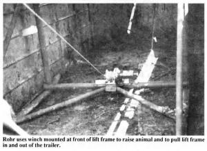 To raise an animal, Rohr slides the lift frame out the back of the trailer over the down animal and extends two adjustable-length legs downward so they rest on the ground. Next he wraps the two lifting belts - made from round baler belts - under the belly of the animal, one toward the front and one toward the back. He runs the winch cable through the lift pulley. It raises the animal off the ground and then pulls it into the trailer, rolling on the overhead track. Once the animal's inside, Rohr lowers it to the floor of the trailer, unhooks the lift cable, and then uses the winch to pull the lift frame back into the trailer by hooking the cable to the front of the trailer. (He also uses the winch to slide the lift frame out of the trailer using a hook at the back of the trailer.)