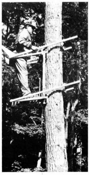 The platform consists of two parts that fit around the trunk of the tree. The operator starts by stepping onto the platform of the lower unit, and standing up with the top part, which is raised to waist level. He then sits down on the top part and raises up the lower part as high as he can with his feet. Then he stands up on the lower part and raises the top part again, repeating the process.