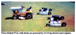 The three-bladed 57-in. wide decks are powered by 12 1/2 hp. Tecumseh OHV electric-start engines. Cutting height adjusts from 1 1/2 to 3 lain. There are four anti-scalp rollers in front and two in back. The two rear transport wheels are fixed while the two front wheels are cantered. The tongue can be mounted on the right or left side of the deck so you can position a pull-behind mower on either side or gang them together on one side. Can be used behind any type of riding mower, garden tractor, small utility tractor, ATV, etc.