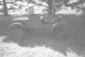 The rig is made from a steel frame covered with plywood and has boat trailer fenders and a curled front end made from stain-less steel sheet metal. It mounts on 8-in. wheelbarrow wheels that are attached to axles made from 5/8-in. dia. steel rod. The seat, which is wide enough for two and has a backrest, is plywood padded with foam and covered by upholstery vinyl. Power is sup-plied by a 3 1/2 hp Kohler engine that chain-drives one of the rear wheels via a friction clutch. A double reduction chain sprocket on one of the rear wheels reduces the rig's speed and increases its power. Steering is done with a "tiller rod" steering lever just like the one used on the original car.