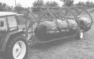 Silage Bale Hauler Loads, Unloads Itself BALE HANDLING Bale Handling (31B) 21-5-27 A new self-loading 8-bale hauler that's specially designed to handle wrapped silage bales without puncturing the plastic is the first bale hauler of its kind in North America, says sales representative Charles Barkman of Chambersburg, Pa.