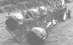 The bale hauler was invented by David Mitchell, an English farmer, and is manufactured by NC Agricultural Engineering Ltd. in Ireland. It's equipped wtih 4 loading arms on each side that are independently operated by separate hydraulic cylinders. The loading arms are attached to a steel floor that's hinged at the middle, allowing either side of the trailer to lower to the ground to pick up a bale. The end of each loading arm is equipped with a short length of horizontal steel tubing that's free to rotate depending on the position of the bale.