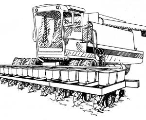 "My design takes advantage of the size of today's new combines, which have more horsepower, greater capacity, more durable drive trains, and much improved visibility and comfort as compared to older ma-chines," says Kaufman. "My goal is to come up with a simple system that uses stock parts and requires no modification of the combine so it can be quickly converted back to conventional use. The toolbar, with row units attached, will be secured to the combine in place of the head. Seed for the row units will be stored in the grain tank and delivered to the individual planter seed units by an air conveying system."