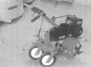 Adaptable to any size or brand tiller, the guidance system replaces the stationary wheels on conventional front tined tillers. It consists of a main frame that bolts to the rear and a pair of 8-in. wheels joined together so they turn in unison.