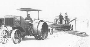 This photo caught our eye because of the outrigger and furrow wheel that guided the Rumely Oil-Pull, reducing driver fatigue on big straight-aways. The small furrow wheel that steered the front right wheel was raised and lowered by a piece of chain.