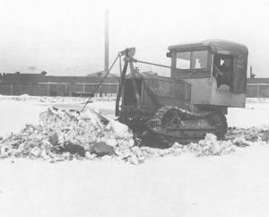 It took two men to operate this special-built Cletrac snow tractor built by the Cleveland Tractor Company in Cleveland, Ohio: One to drive and one to raise and lower the blade. The New York City streets department bought 100 of these tractors. A blade angled at 45? was used to push the snow to the sides of the streets and then the straight pusher blade shown in the photo was used to push the snow up to the manholes where it was dumped into the sewer system to melt away. Before buying these tractors, snow was shoveled by hand into wagons and hauled away.