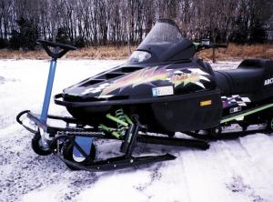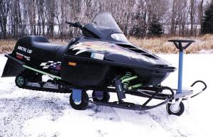 The "SnowVer" is basically a "pallet fork" that fits under the front end between the skis. It's fitted with two 10 in. dia. wheels that "walk" from the front to the back of the forks to lift the sled. Wheels are activated simply by turning a steering wheel, which activates a roller chain that moves the wheels.
