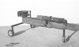 A 4 by 2-in. hydraulic cylinder with 30 in. stroke mounts on top of the I-beam. A car wheel hub fitted with a 16 in. tire rim mounts at one end of the I-beam. Two 2 in. wide pieces of angle iron weld to one side of the wheel rim. A 1 1/4 in. dia. piece of pipe mounts on the I-beam next to the tire rim. A length of steel cable runs from the cylinder to the wheel rim.