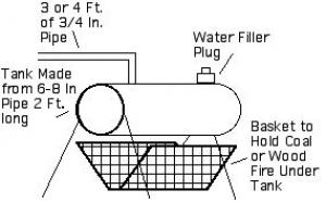 It consists of a tank built from a 2-ft. length of 6 or 8 in. dia. steel pipe. It has two holes in the top. The front one is fitted with a 3 or 4-ft. length of 3/4-in. dia. pipe with rubber hose attached. The tank mounts on four legs with a basket below where I build a wood fire. You simply fill the tank with water and light a fire underneath. As soon as steam comes out the hose, you insert it into the frozen pipe. Quickly thaws them out every time. (Lyle Bryner, 6495 S. 3000 E, Price, Utah 84501)