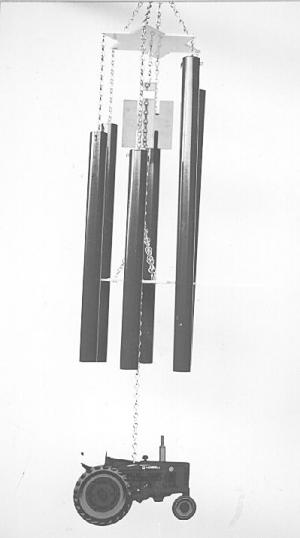 The 31-in. long units consist of powder-coated metal tubes with laser-cut plexiglass tractors or animals suspended by a chain be-low them. The tubes range from 11 to 16 in. long.