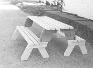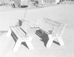 The 6-ft. long benches have backrests. Flipping the backrest forward 90 degrees results in half a picnic table. Put the two benches together and you have a complete table with a 24-in. wide top.