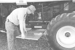 The system consists of a 2-ft. wide aluminum pan that's as long as the combine's grain shoe. It slides onto a frame underneath the shoe. A switch in the cab ties into a 150-lb. air tank, which activates a cylinder that drops the pan while the combine's moving along at harvest speed. The pan collects a representative sample of material discharged out the back.