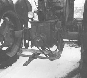 Here's how the tractor's pto power is transferred to the snowblower. An angle iron frame attached to the tractor drawbar supports a 4-ft. long shaft that rides in bearings at each end. The shaft is fitted with a small sprocket. A second, larger sprocket is welded to a splined hub that mounts directly on the pto shaft. The 1 to 2 sprocket ratio doubles the tractor's 540 rpm pto speed to 1,080.