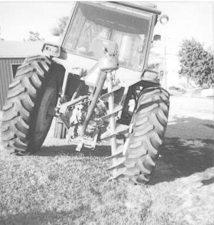 "Digging post holes on our hilly pastures is now a much easier job," says Kolar. He started with a 20-year-old Emco digger equipped with a 9-in. dia. auger. He unbolted the casting from the top of the gear-box, rotated it 1/4 turn, then bolted it back on. He then had a welding shop make a 1/2-in. thick, 6-in. wide steel bracket with rounded ends. A 6-in. long, 3/4-in. inside diameter pipe is welded to the bottom of the bracket in line with the tractor. A bolt inserted through the top of the gearbox casting and through the pipe allows the auger to swing left or right. Another bolt inserted at a right angle through the bracket and the end of the digger mounting arm allows the auger to swing forward or backward. Both bolts have self-locking nuts."