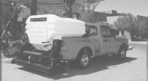 The company's sweeper is a self-contained unit that fits into the bed of almost any pickup. It has a 2-yard capacity poly hopper. A 78-in. wide pickup head rides along the ground and a 10-in. dia. hose sucks debris up into the hopper. Rubber flaps seal the pickup head against the pavement to help generate suction.
