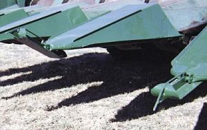 The floating header points simply bolt on in place of the original points. They're equipped with a 1 1/2-ft. long, 6-in. wide flat steel shoe that is free to pivot up or down as it slides along the ground. A steel rod angles downward at the front of the shoe to pick up stalks lying on the ground and move them up onto the point.