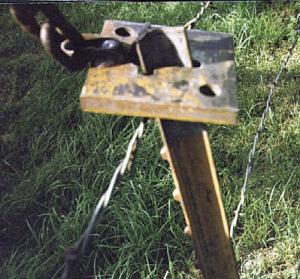 It consists of a 4 by 5-in. piece of 1/2-in. thick sheet metal. It has a "T" cut into the center with a torch that's slightly bigger than a standard 5-ft. steel "T" post. It welds to the end of a log chain.