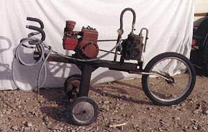 I got the compressor at a junk yard for $5 and bought a 3-hp. Briggs & Stratton gas engine at a yard sale for $7.50. Air is stored in the square tubing that makes up the frame of the cart. I installed a safety pop-off valve off an old hot water heater. There's a front bicycle wheel on front and a pair of small wagon wheels underneath. I put bicycle handlebars on the back side for wheeling it around. (Joeseph Brown, P.O. Box 316, Myton, Utah 84052)