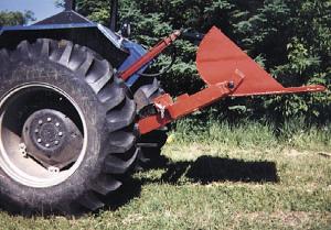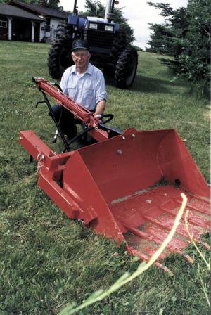The bucket trips with the hydraulic cylinder off an old front end loader, while tractor hydraulics keep it self-leveling at all times. The loader lifts to 4 ft. high.