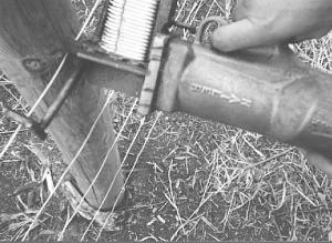 He built a rail to hold his homemade spring-loaded "clips" of staples which consist of 50 staples glued together with a hot glue gun in a jig. He also built a "fork" out of 3/8-in. dia. mild rolled steel and welded it to the bottom of the nail gun to hold the stapler in place while driving staples at a 45 degree angle on posts.