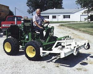 Uhnken used only the front and rear axles of the 4-WD Grizzly, which was equipped with a chain digger on one end and a backhoe on the other, and built a new, shorter 4-ft. sq. frame out of 2 in. sq. tubing. He retained the big 31.5 by 15.5-in. tires off the Grizzly to use on his mower.