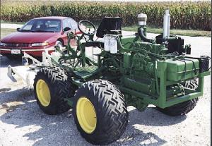 The machine features power steering provided by a Char Lynn system salvaged from a blacktop road spreader and a steering wheel out of an old dune buggy.
