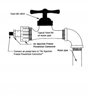 Dan Brown, Christoval, Texas: "I've developed a device that screws onto an outside water faucet that lets you inject air into the faucet to prevent freezing in winter. I call it a Freeze Prevention Connector and it simply screws onto any out side faucet. You attach an air hose, open the water valve, and pump in enough air to push the water back into the building or under the ground. Then close the water valve. When you need water again, all you have to do is open the valve and the air will come out ahead of the water.